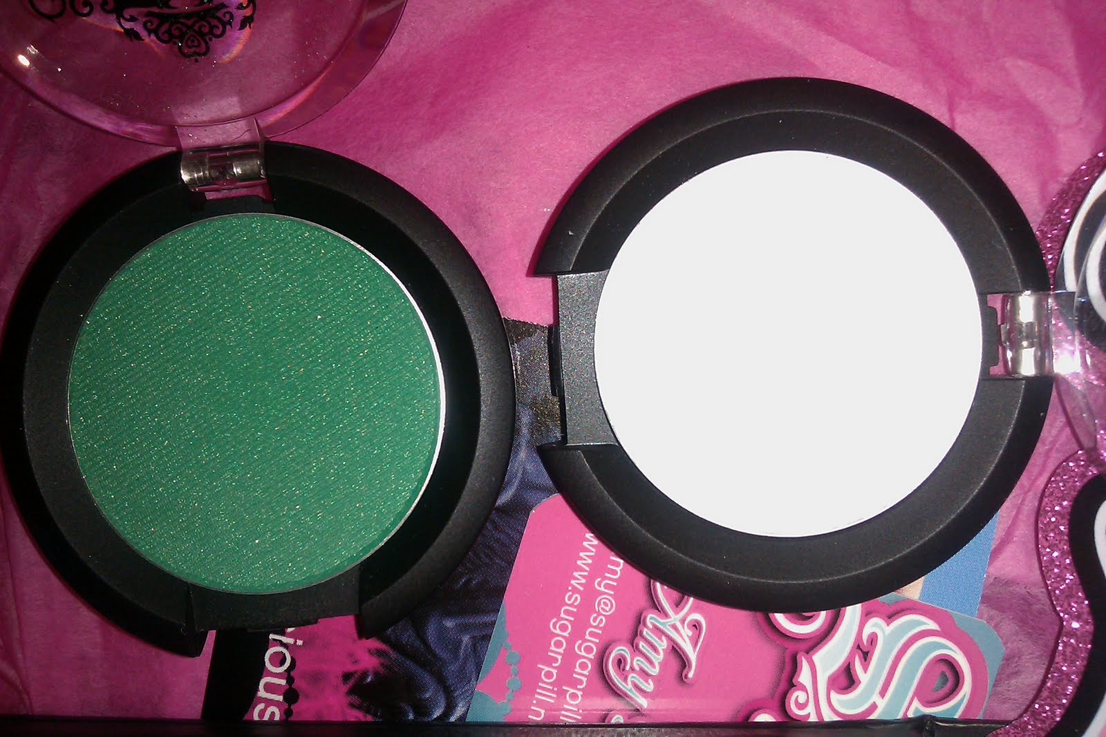 I recently placed my 1st order with Amy at Sugarpill after seeing a few great reviews about the brand. First off, there is soooooo much detail and thought put into the brand, imaging and product quality!!! The box itself was stamped in the lower lefthand corner with the sugarpill cat logo (so cute). The actual products were carefully wrapped in bright pink tissue paper, which follows the basic packaging color scheme. Both the actual product AND the box it comes in are decorated gorgeously. I picked up a 4 shadow palette (mirrored) as well as 2 single shadows... and let me tell you... I was PLEASANTLY surprised to see how HUGE the shadows are. They are bigger than a MAC shadow... about the size of a MUFE single shadow (if not a tad larger). Color intensity is great! What you see is what you get. The eyeshadows apply very even and creamy, not at all chalky and would blend well. A neat feature of the palette is the product names and colors are printed on the back so there is no confusion AND it has a magnetic closure so you don't have to worry about it popping open or damaging the shadows trying to get it open. The clasp on the single shadows closes tightly and was very easy to open and close, and has a cute little "tattoo" detail on the clear flip lid.